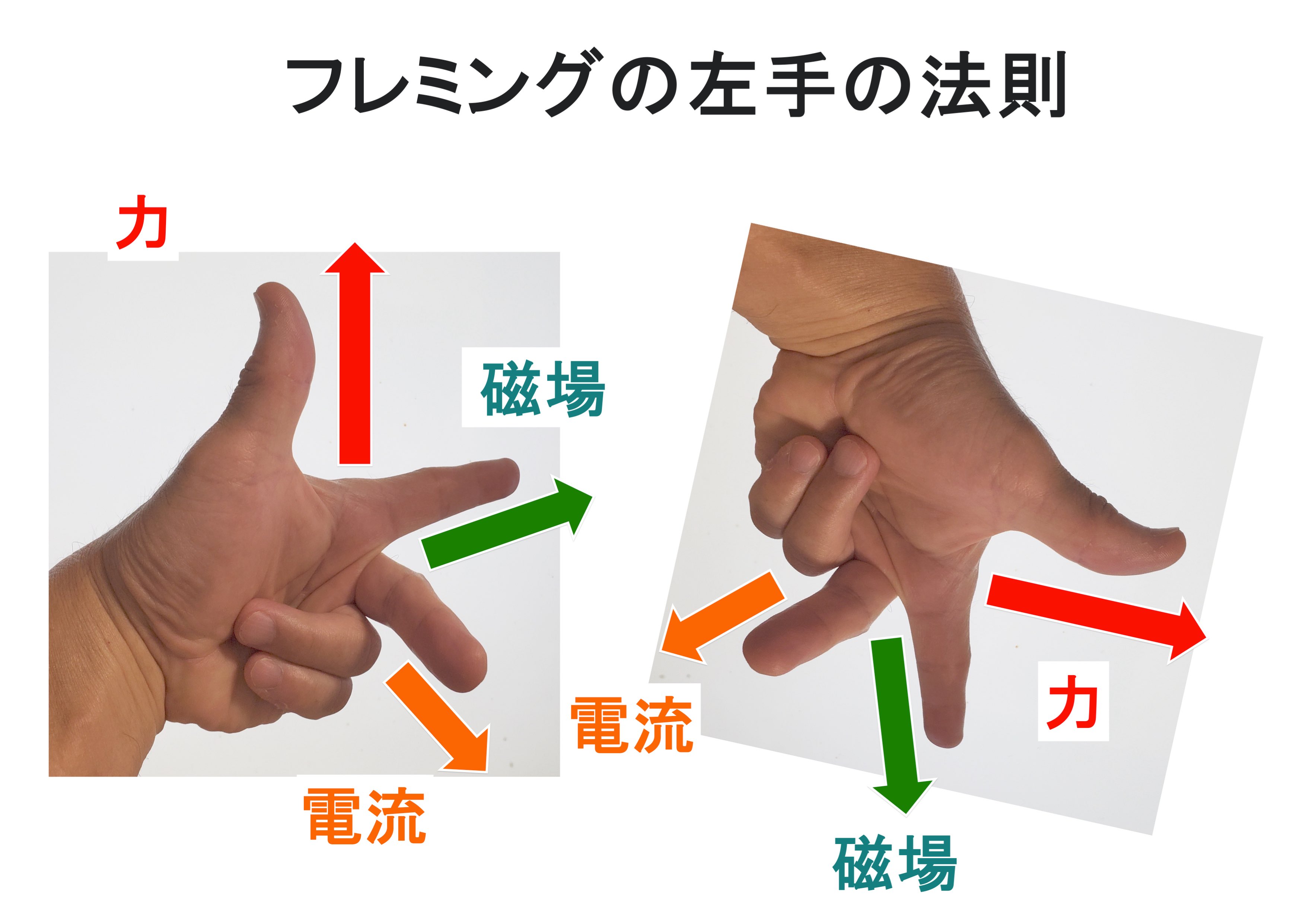 下の図は、有名なフレミングの左手の法則です。 電流と磁場と、電流に働く力の方向を表しています。