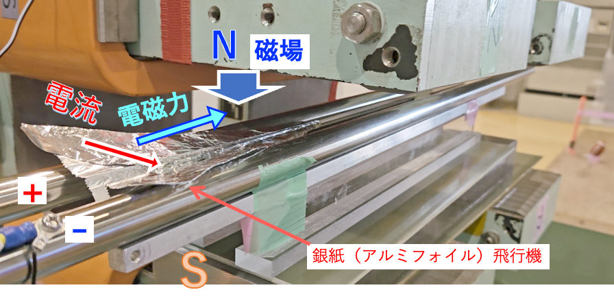 アルミホイルで折られた銀紙飛行機を磁石がつくる磁場中に置いて、 翼の両端の間に電流を流すことにより電流に電磁力が働き、銀紙飛行機を発射します。