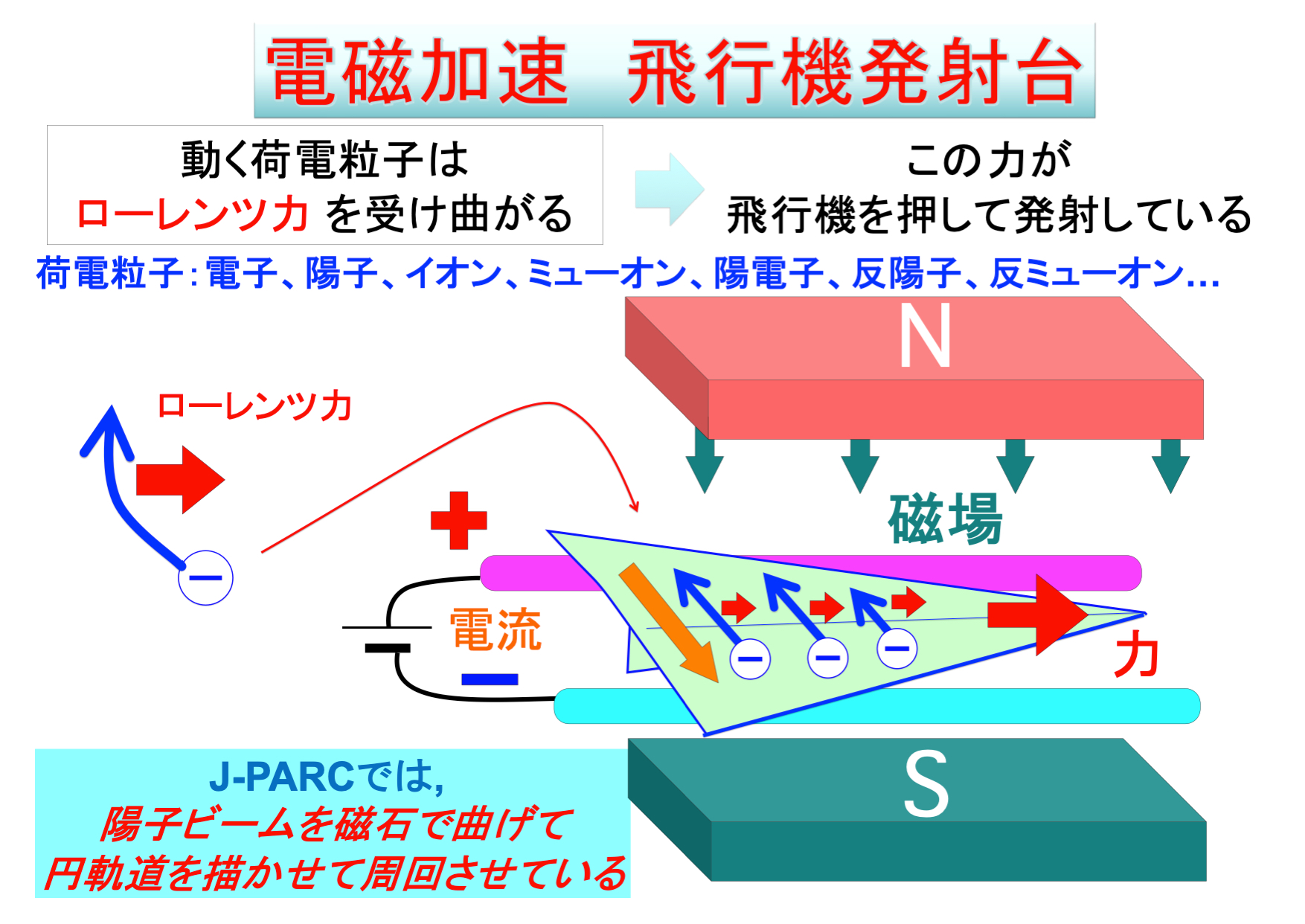 磁場は動いている荷電粒子を曲げることができます。 電流は電子の流れであり電子は速度をもつので、磁場は電子の方向を曲げようとします。しかし、電子は導体(ここでは飛行機)から外には出てこれないので力は飛行機に働き、飛行機は飛び出します。