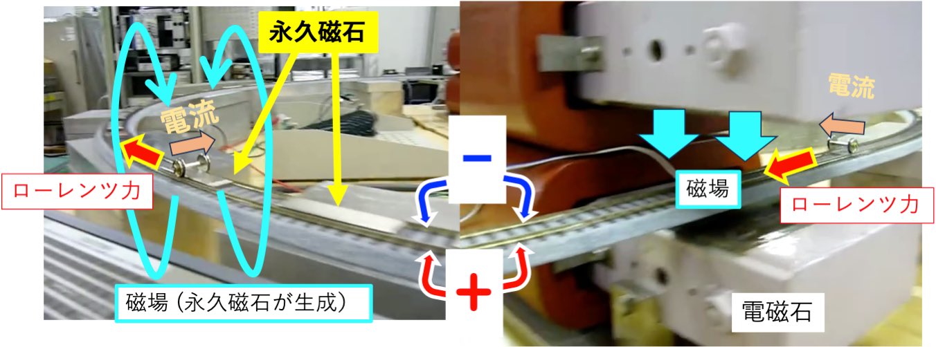 レールに電圧をかけて車軸に電流を流し、永久磁石と電磁石により磁場を作っています