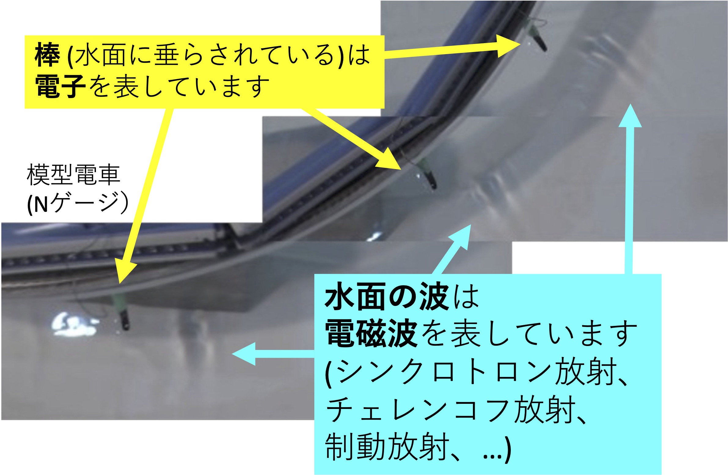 この模型での電子は、おもちゃの電車から水面に垂らされている棒です。