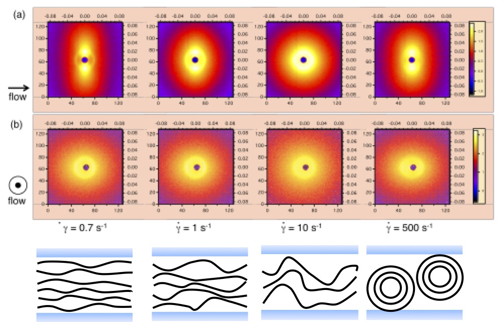 Stimuli-responsible hydroxyapatite-based colloidal liquid crystalline nanorods were examined using in situ small-angle neutron scattering (SANS) and rheological measurements under shear. The experimental results unraveled the effects of the shear force to form the hierarchial morphologies of nano-rods and their transitions.