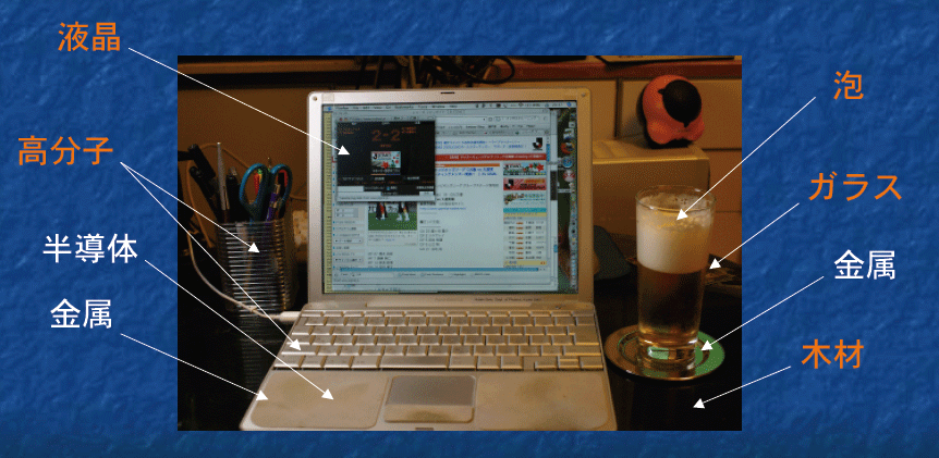 まずは身の回りを見てみよう。あなたがのぞいているディスプレーは液晶が配列して文字や絵を表示しているし、叩いているキーボードのキートップはプラスチックでできている。コンピューターの筐体もプラスチックの場合も多いだろう。手元にあるのはガラスのジョッキに注がれて泡が盛り上がっているビールだろうか?それともコーヒーやお茶だろうか?コーヒーだったらミルクを入れているかもしれない。いずれにせよ飲み終わったら台所に持って行って、洗剤で良く洗うことであろう。手が荒れないようにするためには、ゴム手袋をした方が良いだろう。