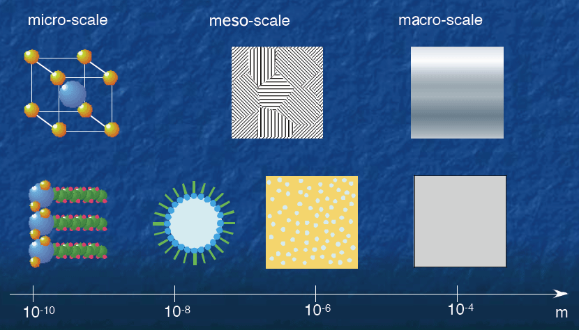 またソフトマターがヘテロな(一様でない、と言うこと)物質系であり、ほとんどの場合中間スケールの構造を持っている、と言うことも事情を複雑にしている要因の一つだ。例えば固体の場合は原子が数Åのスケールで規則正しく並んでいるので、その並んでいる一つの単位(「単位格子」と言われる)の中の電子状態を理解すればマクロな性質も理解できる。(正確には「理解できる場合が多い」と言うべきだが。)すなわち量子力学によるミクロな状態の理解が、マクロな物性の理解に直結する。(一方単純な気体や液体の場合には、統計力学や熱力学が活躍する。こちらは原子や分子の詳細に関わらず、集団としての振舞いを記述できる。)