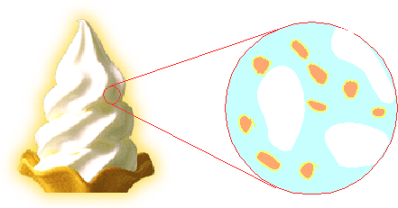 それに対してソフトマターは、多くの場合原子スケールからナノスケール、マクロスケールに至る数層の階層構造を持っている。例えばソフトクリーム(ベタな例だけど)は、氷やタンパク質、油脂、空気等がミリメートル以下のサイズのクラスターをなし、これらが混合していると言う立派な(?)コロイドである。もし分子スケールで混じり合って規則格子を組んでいたりしたら、絶対に滑らかな(ソフトな)舌触りは得られない。